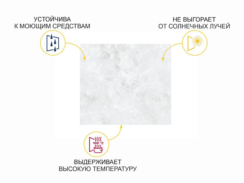 Дизайн стеновой панели «Бостон» с имитацией текстуры светлого мрамора создает ощущение сдержанной элегантности. Серый цвет визуально расширяет пространство кухни, делая её просторной и светлой.