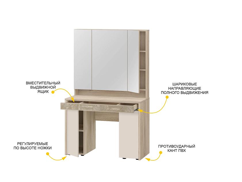 Туалетный столик оснащен вместительным выдвижным ящиком и большим количеством удобных полок для хранения мелочей, а трехстворчатая конструкция зеркала позволяет осмотреть себя со всех сторон.