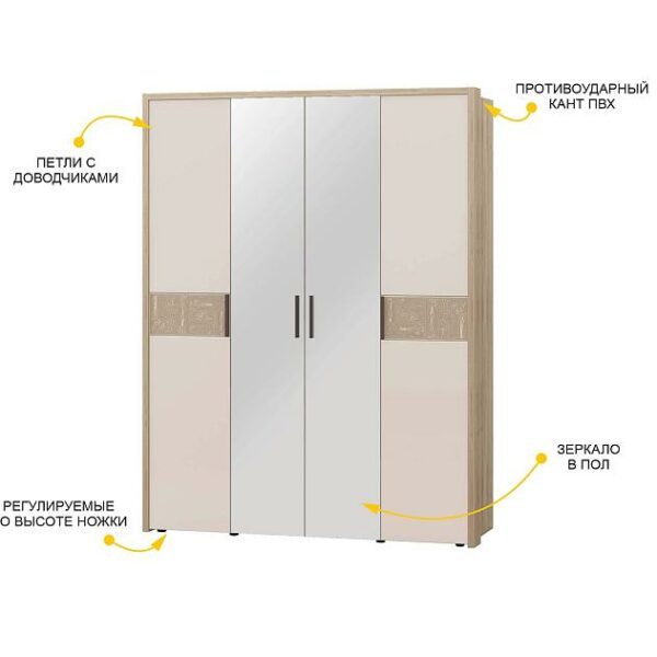 Шкаф состоит из четырех модулей, в состав которых входят секционные стяжки, позволяющие выровнять топы шкафов в одну линию и придать шкафной группе аккуратный законченный внешний вид.