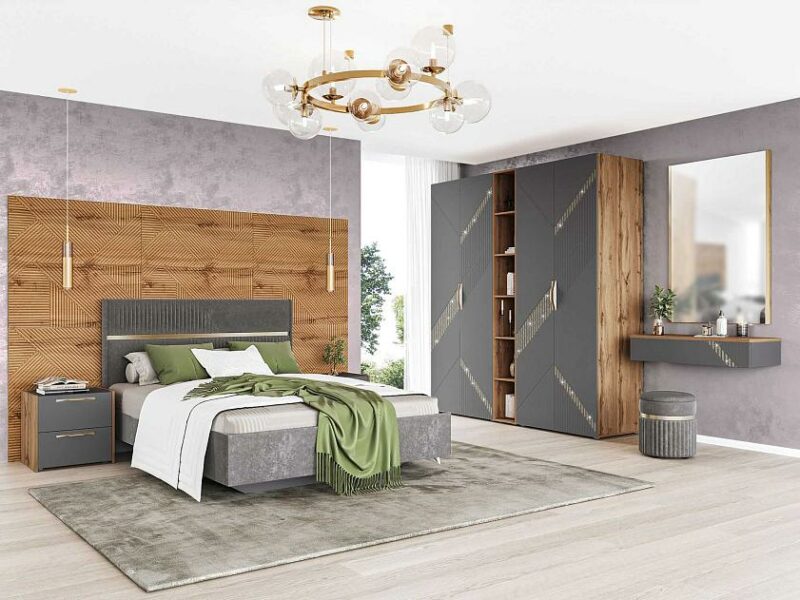Спальный гарнитур «Монако 902 105» — это образец элегантного стиля и утонченного вкуса. Сочетание матовой графитовой поверхности фасадов с благородной древесной текстурой создает особую атмосферу гармонии и комфорта.