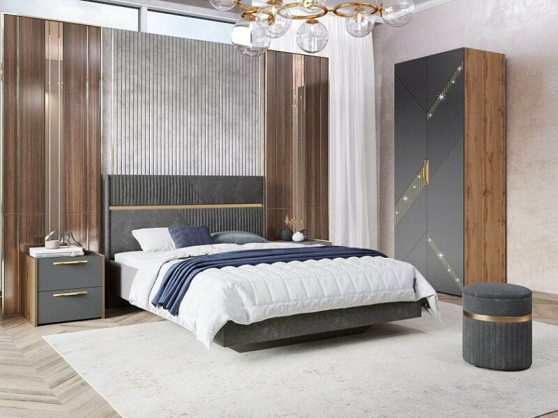 Спальный гарнитур «Монако 902 109» — это образец элегантного стиля и утонченного вкуса. Сочетание матовой графитовой поверхности фасадов с благородной древесной текстурой создает особую атмосферу гармонии и комфорта.