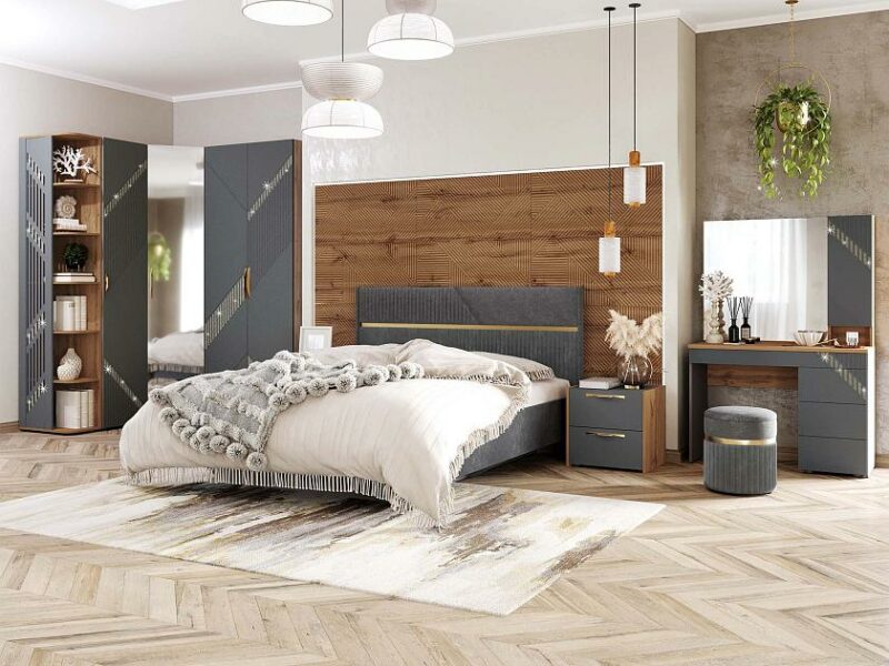Спальный гарнитур «Монако 902 119» — это образец элегантного стиля и утонченного вкуса. Сочетание матовой графитовой поверхности фасадов с благородной древесной текстурой создает особую атмосферу гармонии и комфорта.