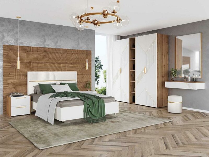 Спальный гарнитур «Монако 903 105» — это образец элегантного стиля и утонченного вкуса. Сочетание матовой белоснежной поверхности фасадов с благородной древесной текстурой подчеркивает изысканный дизайн коллекции.