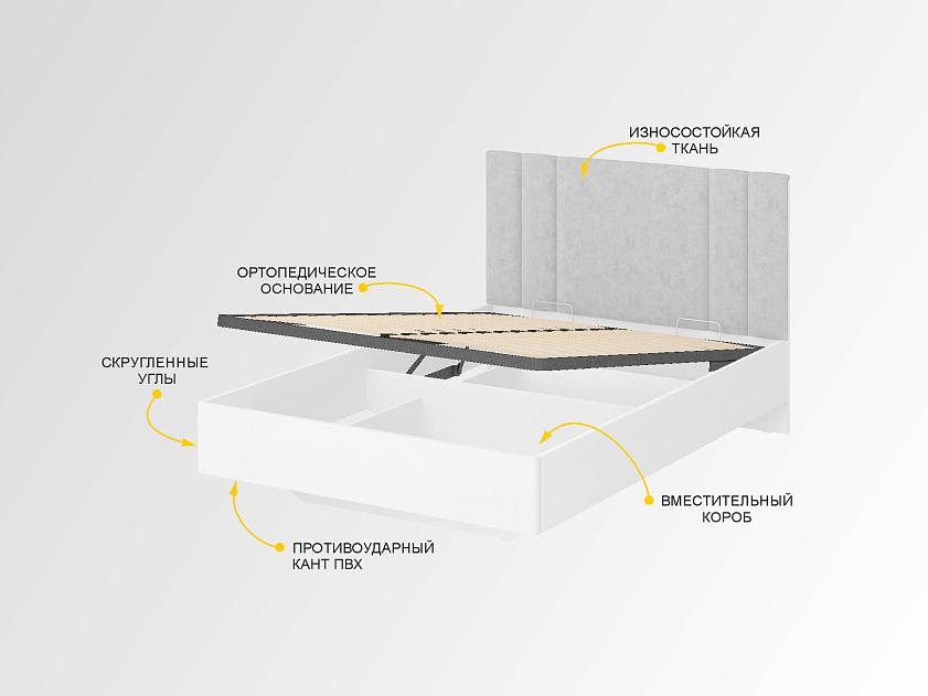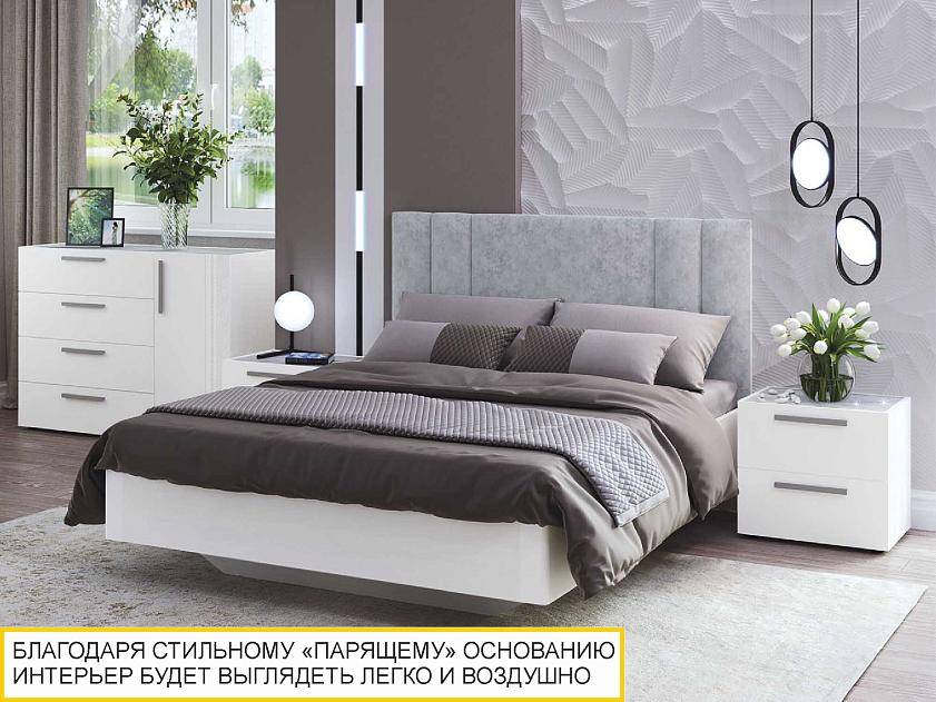 матовую поверхность фасадов дополняют лаконичный 3D-рисунок и фрезеровка. Стеклянные вставки с мраморным рисунком и деликатным мерцающим блеском привлекают внимание и подчеркивают уникальность коллекции. Изголовье кровати, выполненное из софт-велюра нежно-серого цвета, подарит интерьеру Вашей спальни ощущение гармонии и спокойствия.