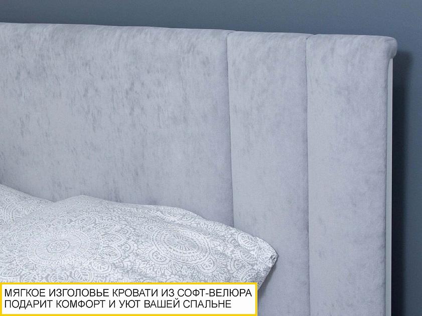 Спинка кровати выполнена из прочного и износостойкого софт-велюра, отличается повышенной степенью комфорта, что обеспечивается мягким наполнителем и приятной на ощупь тканью обивки.