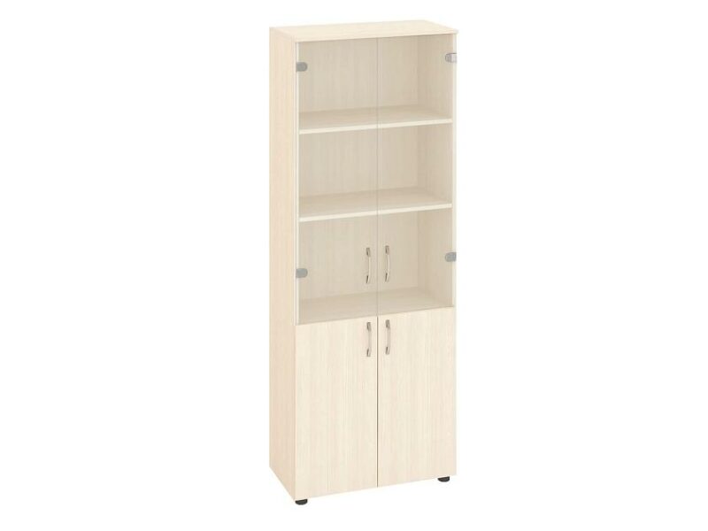 Стеллаж «Рубин 40 533» является частью коллекции мебели для офиса «Рубин». Укомплектован стеклянными и глухими дверцами с металлическими ручками.