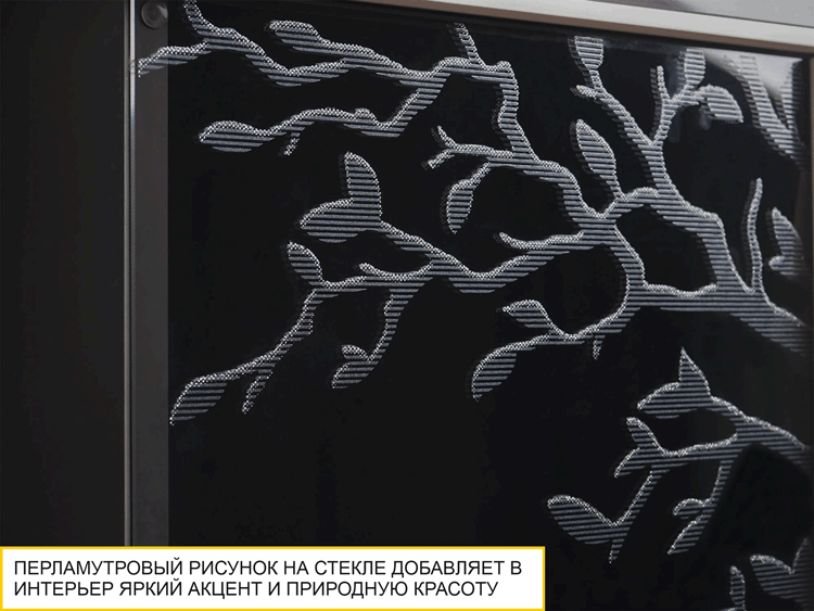 Перламутровый рисунок на стекле витрины, дополненный глиттером, отличается своей утонченностью. Он делает витрину ярким акцентом в интерьере, добавляя природную красоту в гостиную.