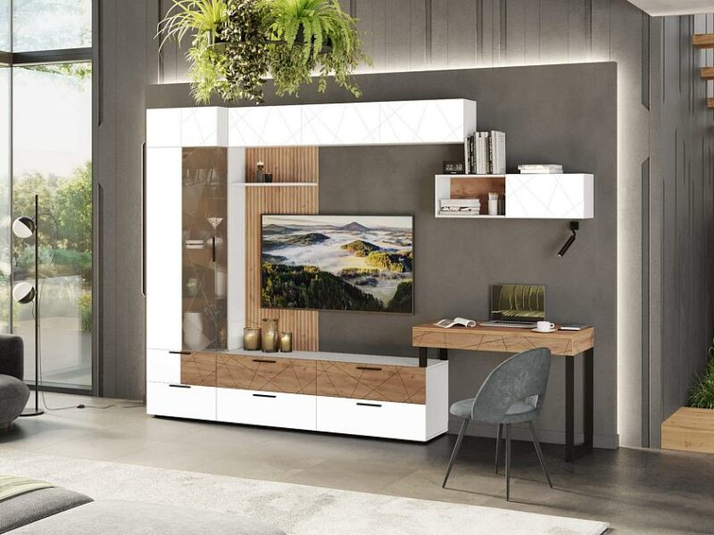 Гостиная обладает высокой функциональностью за счет большого количества разных модулей, позволяя размещать необходимые вещи, книги, декор и прочие предметы.