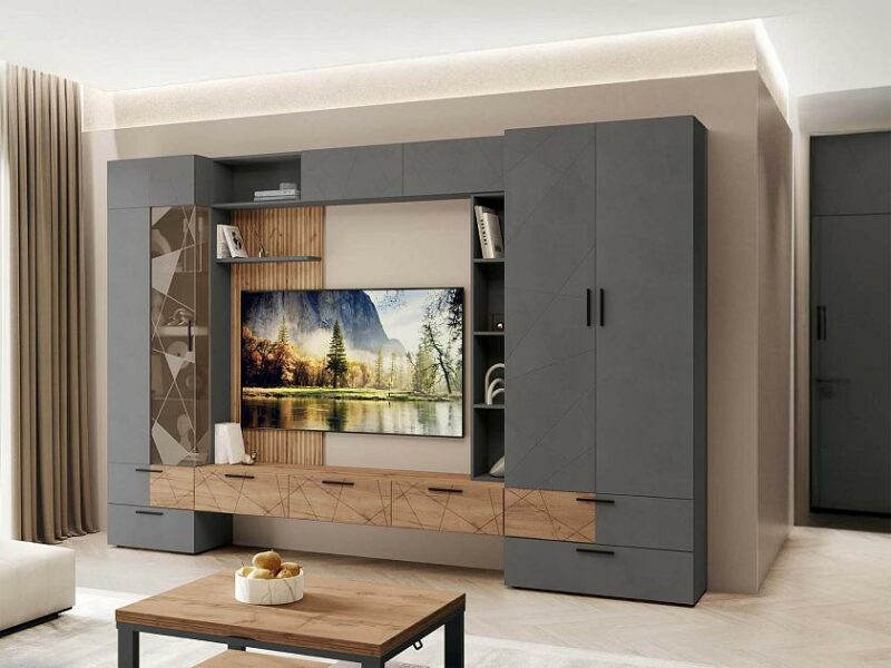 Гостиная обладает высокой функциональностью за счет большого количества разных модулей, позволяя размещать необходимые вещи, книги, декор и прочие предметы.