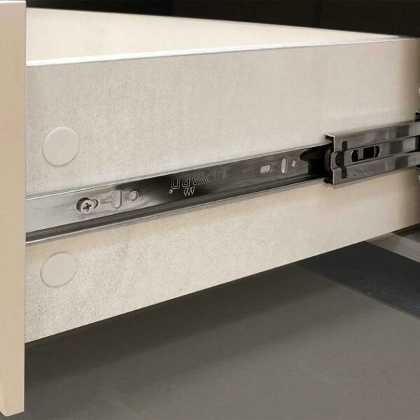 Современная и качественная фурнитура добавляет удобства и комфорта в использовании. Дверца витрины оснащена петлями с доводчиками. Выдвижные ящики тумбы оборудованы системой плавного закрывания скрытого монтажа.