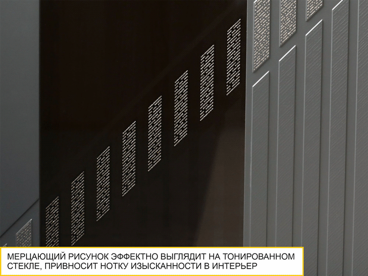 Мерцающий рисунок на стекле витрины плавно переходит на фасад. Тонированное стекло эффектно подчеркивает этот рисунок, привносит нотку изысканности и элегантности в интерьер.