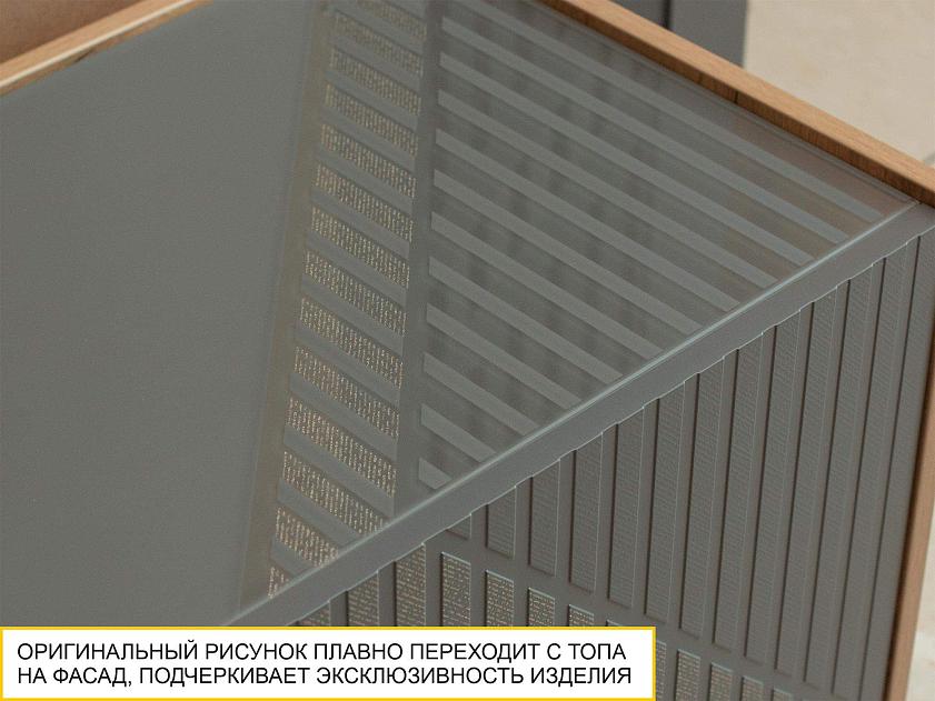 Верхняя поверхность тумбы декорирована стеклянной вставкой с авторским рисунком. Сочетание матовой и глянцевой поверхности формирует оригинальный узор, который плавно переходит в рисунок на фасаде.
