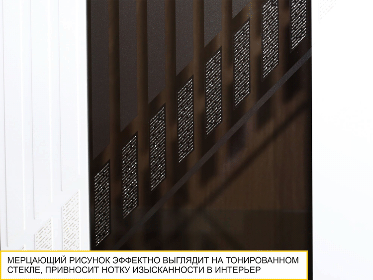 Мерцающий рисунок на стекле витрины плавно переходит на фасад. Тонированное стекло эффектно подчеркивает этот рисунок, привносит нотку изысканности и элегантности в интерьер.