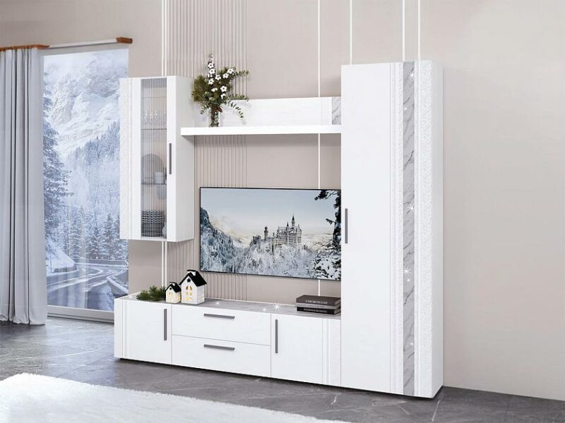 Стенка для гостиной «Николь 603 403» – это сочетание безупречного дизайна и неповторимой атмосферы комфорта. Белоснежные матовые фасады и нежно-серый мерцающий декор «мрамор» – визитная карточка этой коллекции.