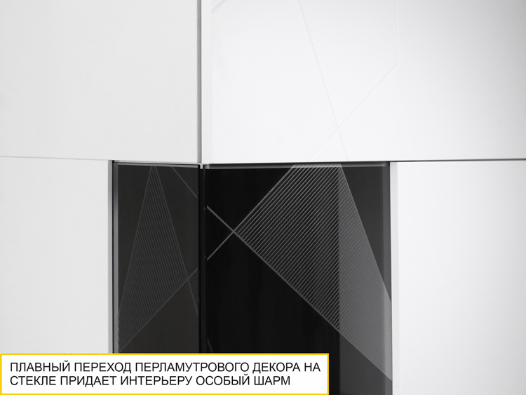Витрина с тонированным стеклом и перламутровым рисунком смотрится эффектно и изящно. Стеклянные полки визуально расширяют пространство. Они просты в уходе и позволяют красиво расставить предметы декора и другие ценности.