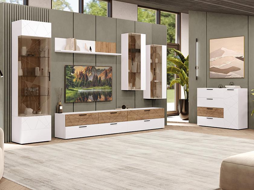 Гостиная обладает высокой функциональностью за счет большого количества разных модулей, позволяя размещать необходимые вещи, книги, декор и прочие предметы.