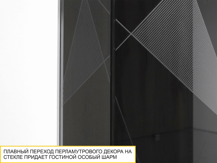 Витрины с тонированным стеклом и перламутровым рисунком смотрятся эффектно и изящно. Стеклянные полки визуально расширяют пространство. Они просты в уходе и позволяют красиво расставить предметы декора и другие ценности.