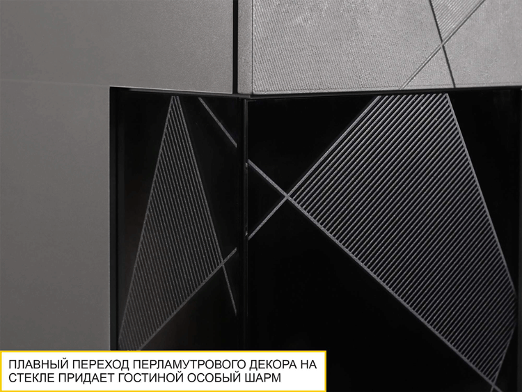 Витрина с тонированным стеклом и перламутровым рисунком смотрится эффектно и изящно. Стеклянные полки визуально расширяют пространство. Они просты в уходе и позволяют красиво расставить предметы декора и другие ценности.