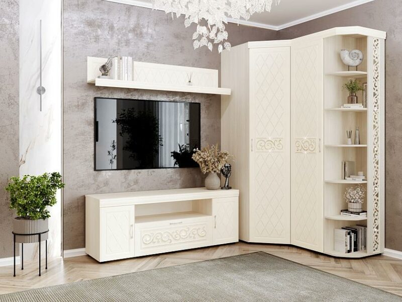 Стенка для гостиной «Тиффани 40» – атмосфера изысканности и нежности у Вас дома. Светлые фасады и ажурный мерцающий декор с кристаллами премиум-класса – отличительная черта данной коллекции.