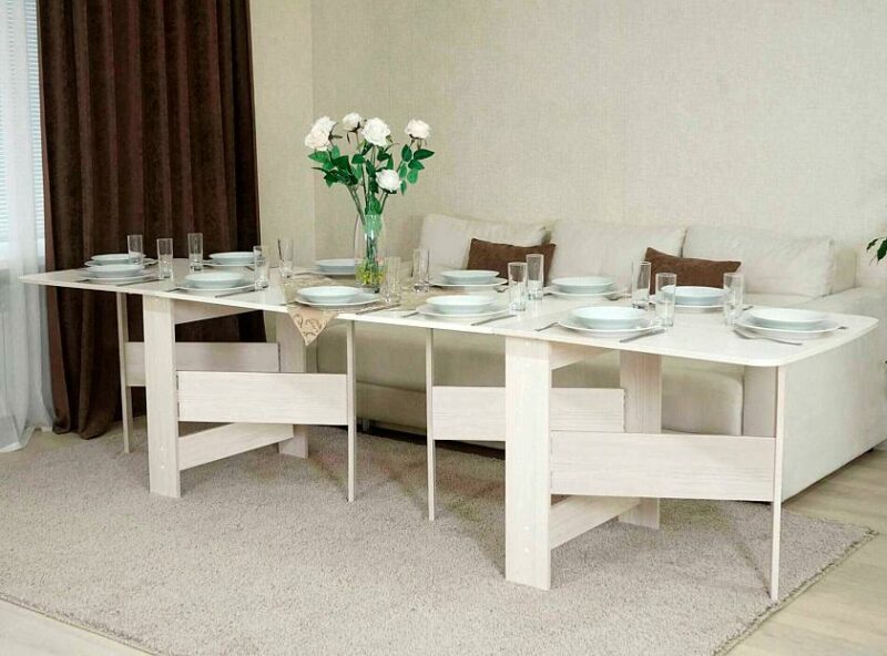 — в сложенном виде стол представляет собой небольшую тумбу размером 35х80 см, которую можно использовать как подставку для цветов;