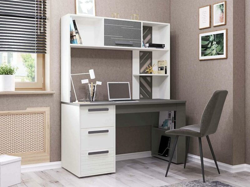 Актуальное цветовое решение – сочетание белого с глубоким темно-серым цветом и лаконичные формы стола с легкостью впишутся в любой интерьер комнаты или рабочего кабинета.