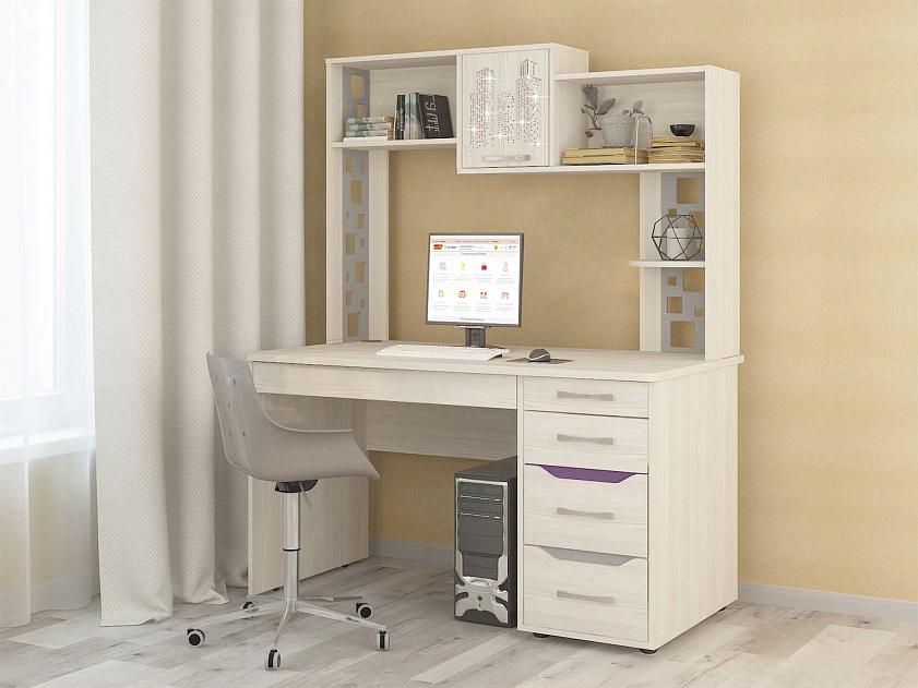Просторная поверхность стола позволит удобно разместить как компьютерное оборудование, так и канцелярские принадлежности. В столе установлены четыре выдвижных ящика и один под столешницей. В надстройке находится отделение с дверцей, а также открытые полки с металлическими разделителями для книг. Стол можно приобрести как с надстройкой, так и без нее.