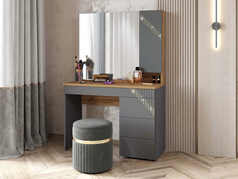 Туалетный столик «Монако 902.06» является частью модульной программы «Монако 902». Коллекция «Монако» — это образец элегантного стиля и утонченного вкуса. Сочетание матовой графитовой поверхности фасадов с благородной древесной текстурой создает особую атмосферу гармонии и комфорта.