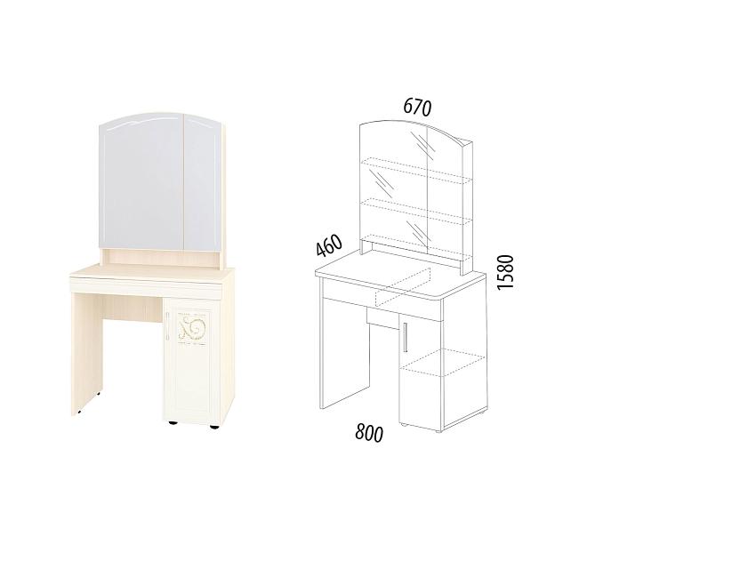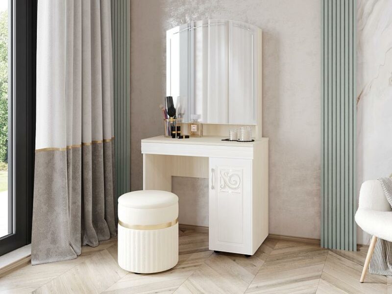 Туалетный столик произведен из МДФ и ЛДСП повышенной плотности. Материал устойчив к механическим и термическим воздействиям. ЛДСП выдерживает min 300 циклов на истирание, что почти в 5 раз больше, чем требуется по ГОСТу (min 65).