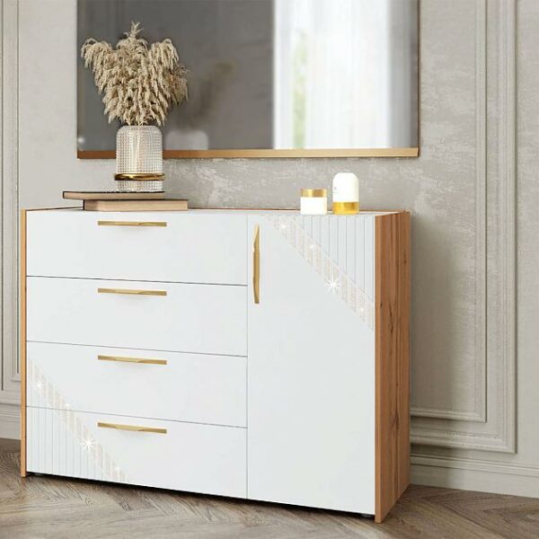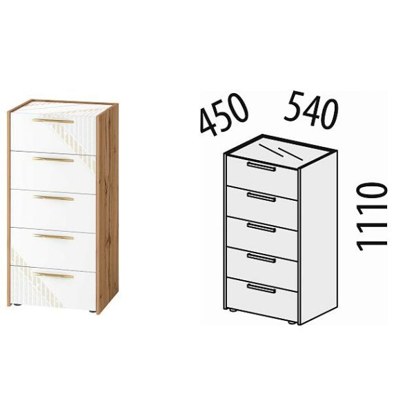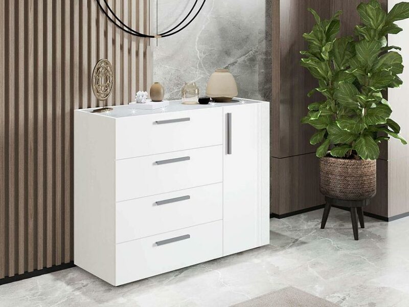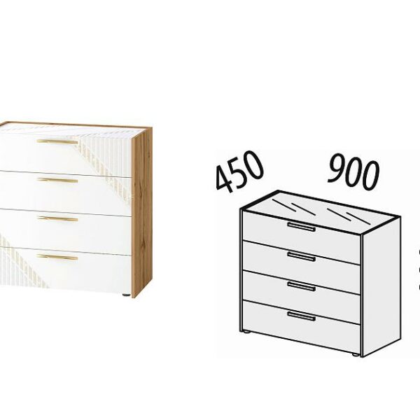 Комод «Николь 901.23» является частью модульной программы «Николь». Сочетание белоснежных матовых фасадов с нежно-серым мерцающим декором «мрамор» — визитная карточка этой коллекции. Конструктив и дизайн модели продуман до мелочей.