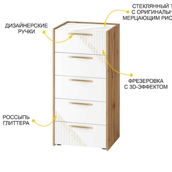 Стеклянная крышка комода выполнена из прочного осветленного стекла Crystal с рисунком «мрамор». Дизайнерский рисунок «мрамор» с утонченным мерцанием благодаря стеклу не стирается и не выцветает со временем.