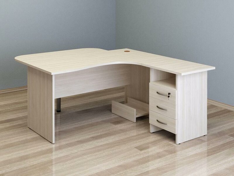 «Альфа 63 566» – набор мебели для офиса, который состоит из комфортного стола с приставной тумбой для хранения офисных принадлежностей, подставки под системный блок и приставки.