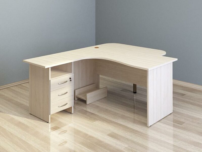 «Альфа 63 568» – набор мебели для офиса, который состоит из комфортного стола с приставной тумбой для хранения офисных принадлежностей, подставки под системный блок и приставки.