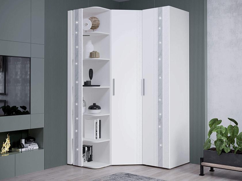 Угловой шкаф в комплекте «Николь 901 314» является частью модульной программы «Николь». Сочетание белоснежных матовых фасадов с нежно-серым мерцающим декором «мрамор» — визитная карточка этой коллекции. Конструктив и дизайн модели продуман до мелочей. Рекомендация наших дизайнеров: если хотите сэкономить пространство в комнате, используйте для хранения одежды угловые шкафы.