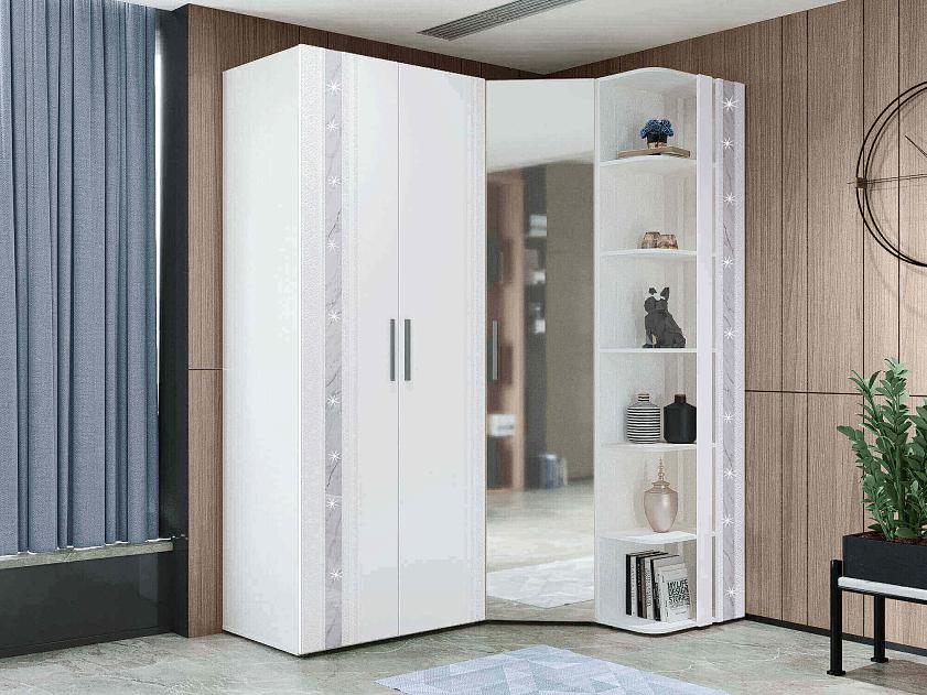 Угловой шкаф с зеркалом в комплекте «Николь 901 315» является частью модульной программы «Николь». Сочетание белоснежных матовых фасадов с нежно-серым мерцающим декором «мрамор» — визитная карточка этой коллекции. Конструктив и дизайн модели продуман до мелочей. Рекомендация наших дизайнеров: если хотите сэкономить пространство в комнате, используйте для хранения одежды угловые шкафы.