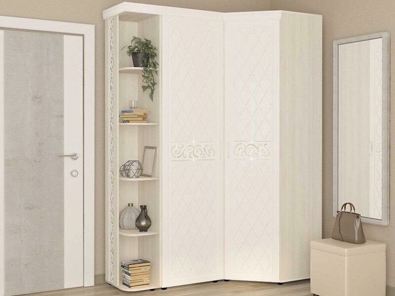 Угловой шкаф в комплекте «Тиффани 6» является частью модульной программы «Тиффани». Коллекция «Тиффани» — символ классического стиля и незабываемого шарма. Нежные светлые фасады и изысканный ажурный декор с кристаллами премиум-класса – отличительная черта коллекции.