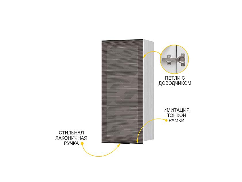 Геометрический рисунок на стекле поддерживает общую концепцию изделия, придает кухне современный внешний вид.
