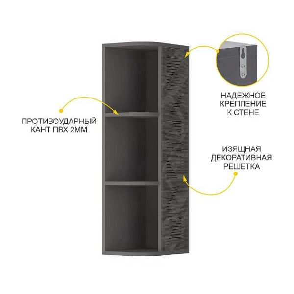 Дверца оснащена петлями с доводчиками для плавного и бесшумного закрывания. Модуль декорирован фрезеровкой и оригинальным рисунком на стекле.