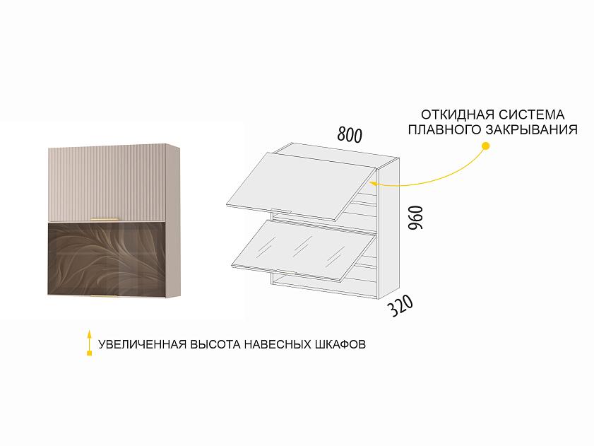Увеличенная высота навесных шкафов до 96 см создает впечатление большего объема и высоты кухни, делая помещение более просторным и светлым.