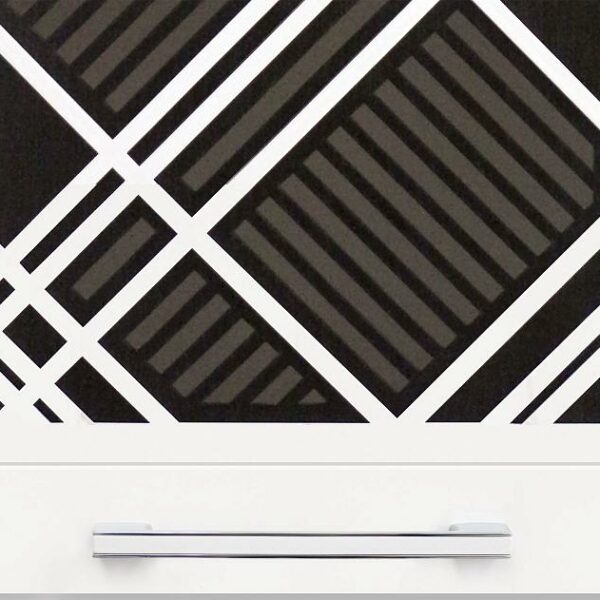 Геометрический рисунок на стекле поддерживает общую концепцию изделия, придает кухне современный внешний вид.