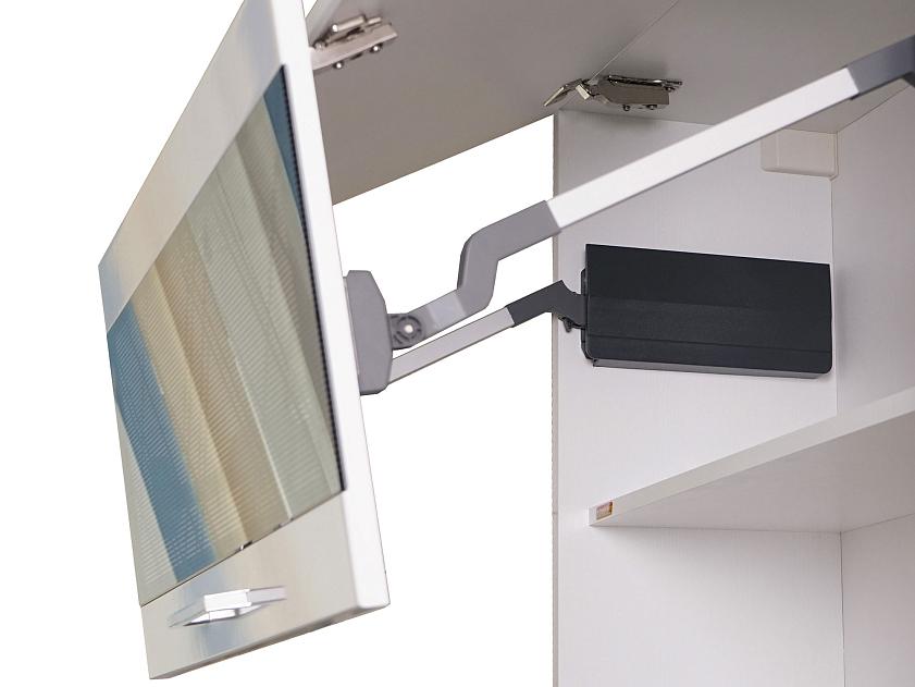 Дверцы шкафа оснащены подъемным механизмом со складной системой, который позволяет легким движением открыть сразу две дверцы и удерживать их в любом положении.
