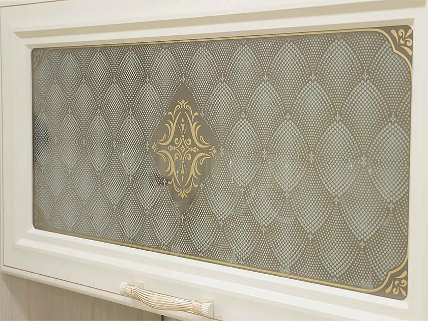 Шкаф-витрина «Милана 23.09.1» является частью модульного набора для кухни «Милана». Модуль декорирован фрезеровкой и оригинальным рисунком на стекле.