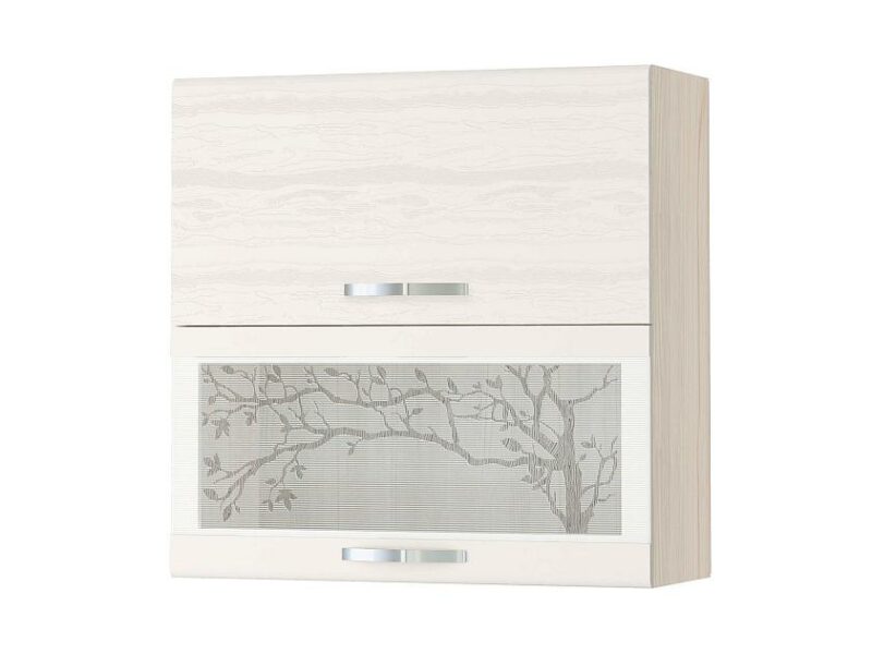 Фасад с рисунком на стекле придает кухне изысканный внешний вид.