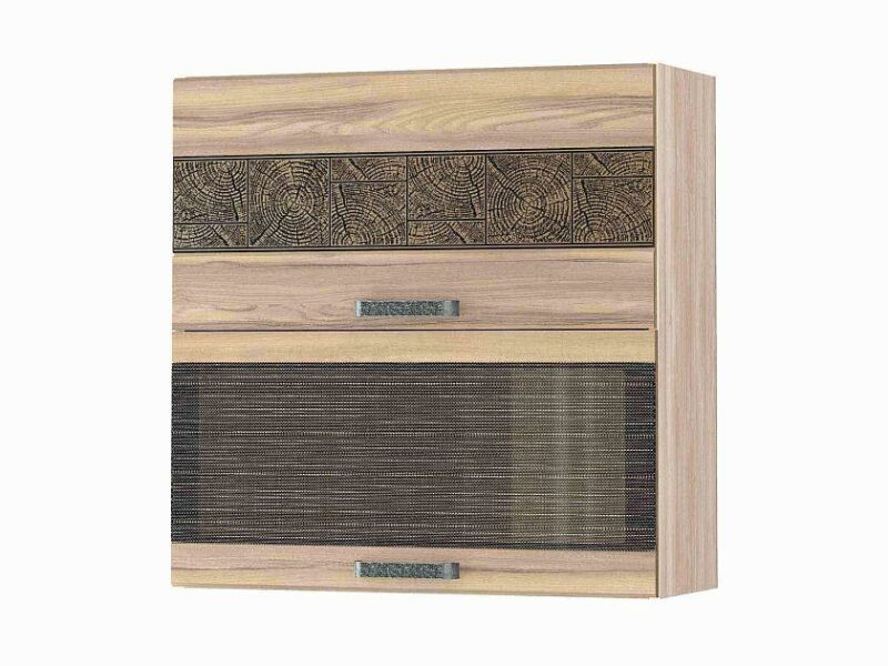 Патинирование придает изделию благородный внешний вид. Рисунок на тонированном стекле устойчив к истиранию и придает кухне изысканный внешний вид. Дверцы шкафа оснащены подъемным механизмом с откидной системой, который обеспечивает плавное закрывание дверец и возможность удержать их в любом положении.