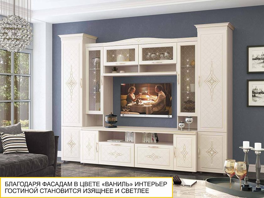 Благодаря светлым фасадам в цвете «Ваниль» интерьер гостиной обретает утонченность и изящество, становится светлее и просторнее.