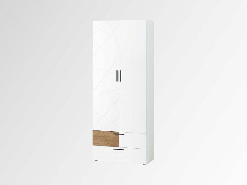 В левой части шкафа установлена штанга для хранения одежды на плечиках. В правом отделении предусмотрены полки для хранения вещей. Внизу шкафа находятся два вместительных выдвижных ящика.