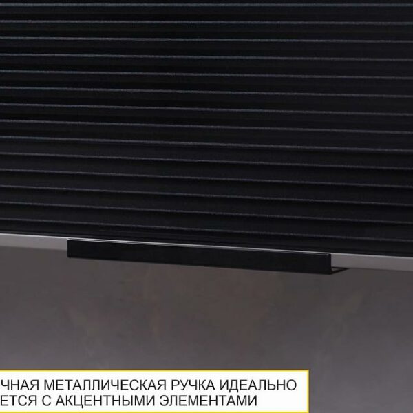 Отсутствие лицевой фурнитуры подчеркивает современный дизайн мебели, дверцы модулей легко и удобно открываются за счет свеса фасада.