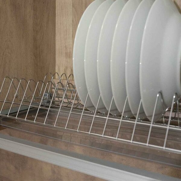 Полки регулируются по высоте, что позволяет удобно хранить кухонные принадлежности.