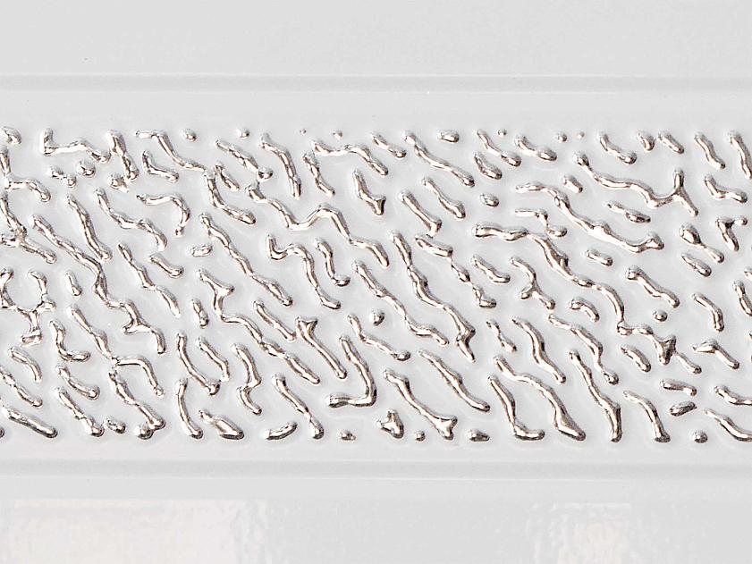 Привычная строгая геометрия глянцевого кухонного фасада дополнена нежным 3D-декором в серебре.