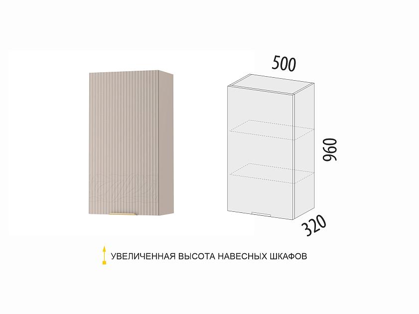 Увеличенная высота навесных шкафов до 96 см создает впечатление большего объема и высоты кухни, делая помещение более просторным и светлым.