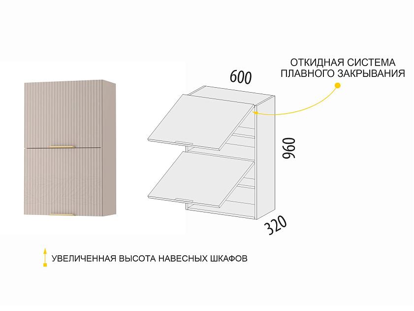 Увеличенная высота навесных шкафов до 96 см создает впечатление большего объема и высоты кухни, делая помещение более просторным и светлым.